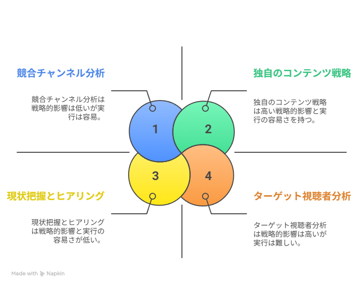 - 競合チャンネル分析: 貴社の競合となるYouTubeチャンネルの成功要因や課題を分析し、差別化ポイントを明確にします。
