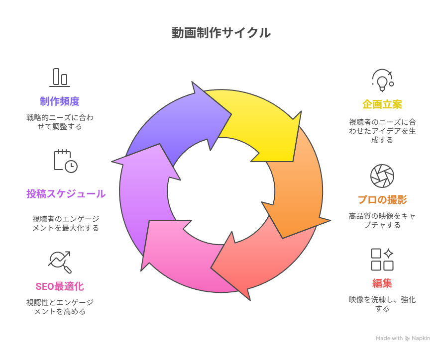 戦略に基づき、視聴者の心を掴むプロ品質の動画コンテンツを制作します。