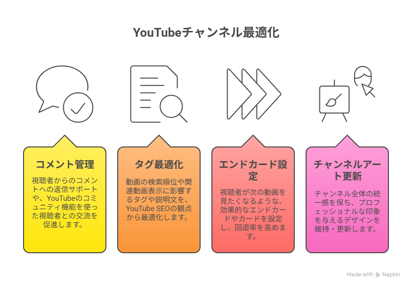 - チャンネルアート・アイコン更新: チャンネル全体の統一感を保ち、プロフェッショナルな印象を与えるデザインを維持・更新します。