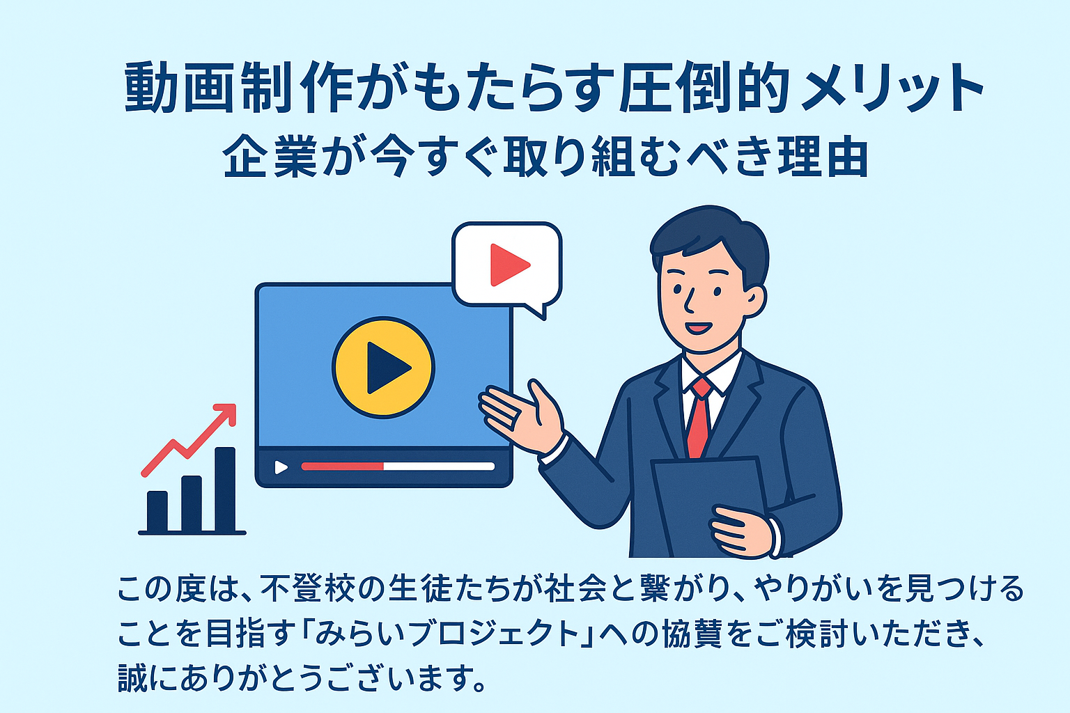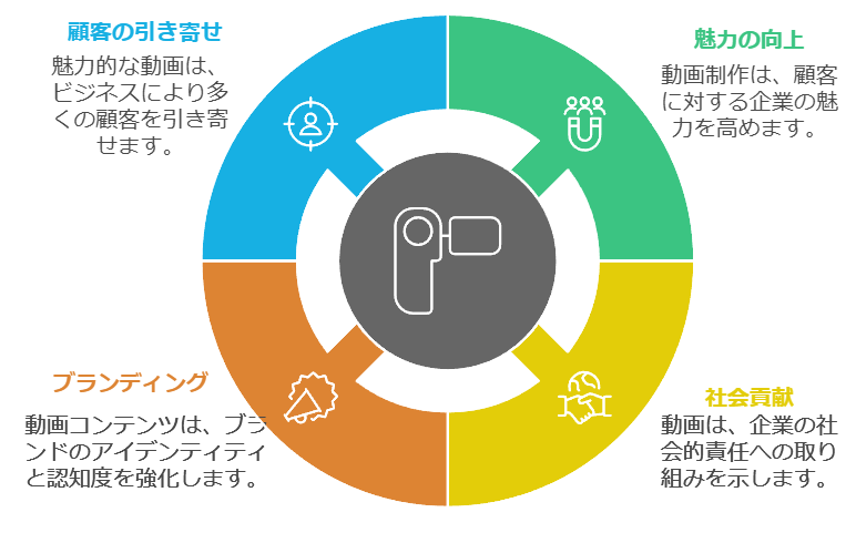 動画制作は、今や企業が顧客と繋がり、成長を遂げるための必須の手段です。動画を活用することで、企業の魅力を最大限に引き出し、社会貢献やブランディング、集客など多方面にわたって大きなメリットを享受できます。今こそ、動画を取り入れ、未来のビジネス成功に向けた第一歩を踏み出しましょう。