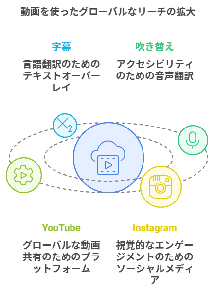 動画は言語の壁を越えて情報を伝えることができるため、海外展開を目指す企業にも非常に有効です。字幕や吹き替えを用いることで、他国の顧客にも簡単にアプローチでき、世界中にメッセージを届けることができます。特に、グローバルなプラットフォームであるYouTubeやInstagramを活用することで、国境を越えた市場への参入が容易になります。